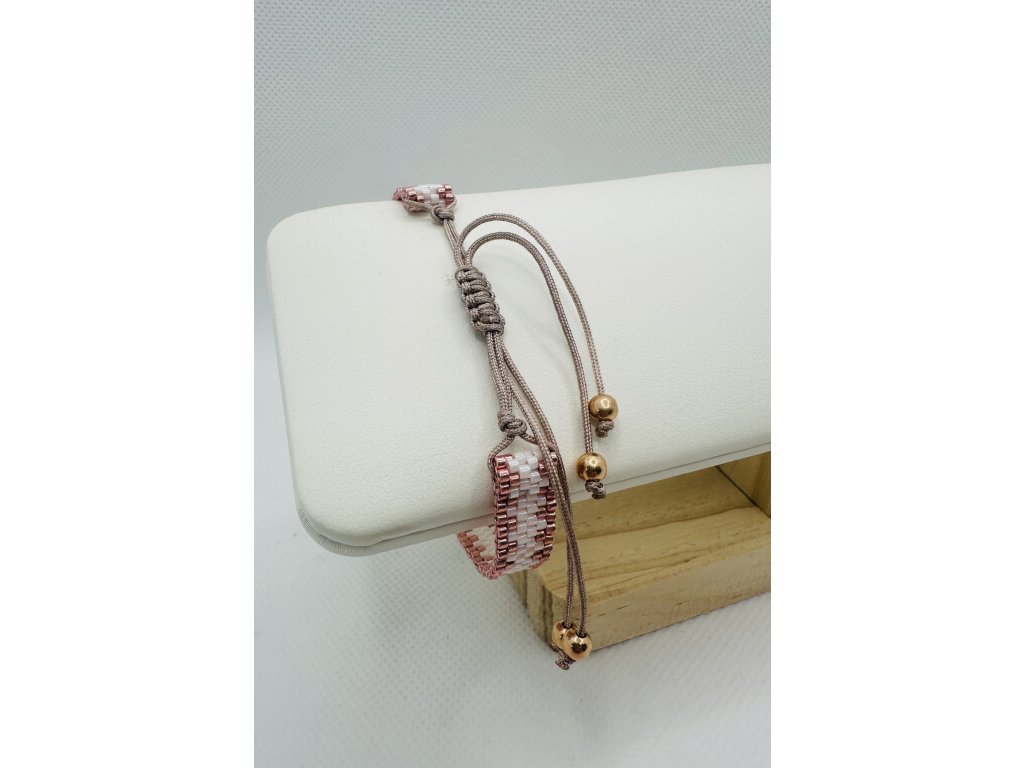 Použitý materiál: Japonské korálky, nylonová šňůrka, stříbrné kuličky pozlacené 18 k růžovým zlatem.